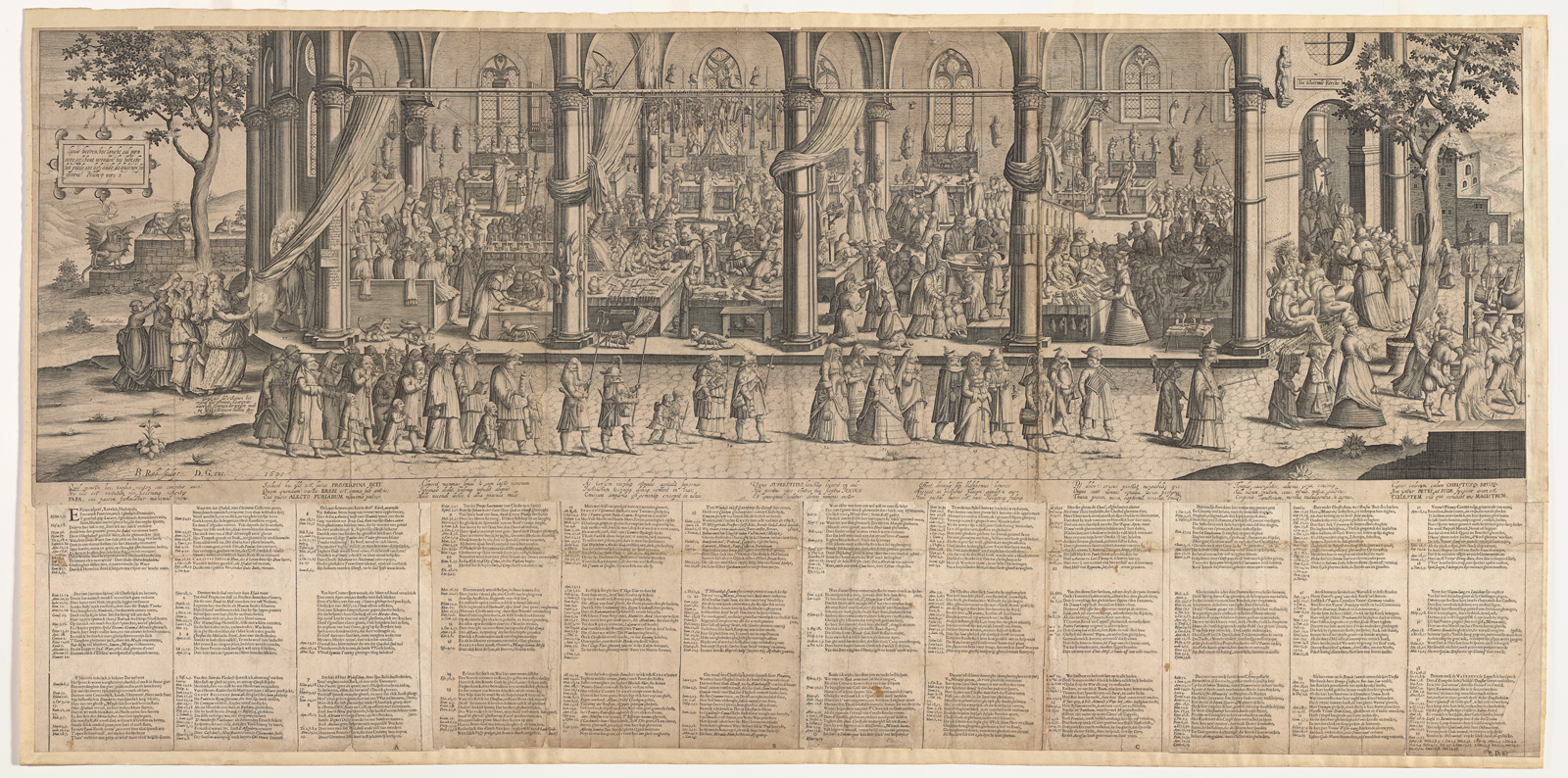 DescriptionFig. 10 Robert Baudous after Nic. Anglois, Tafereel oft onderwiisinge der eenvoudige, voorstellende twee verscheyden religien (Tableau or teaching of the simple, depicting two different religions), ca. 1600, engraving, 430 × 1875 mm. Atlas Van Stolk, Rotterdam, inv. no. 60692
